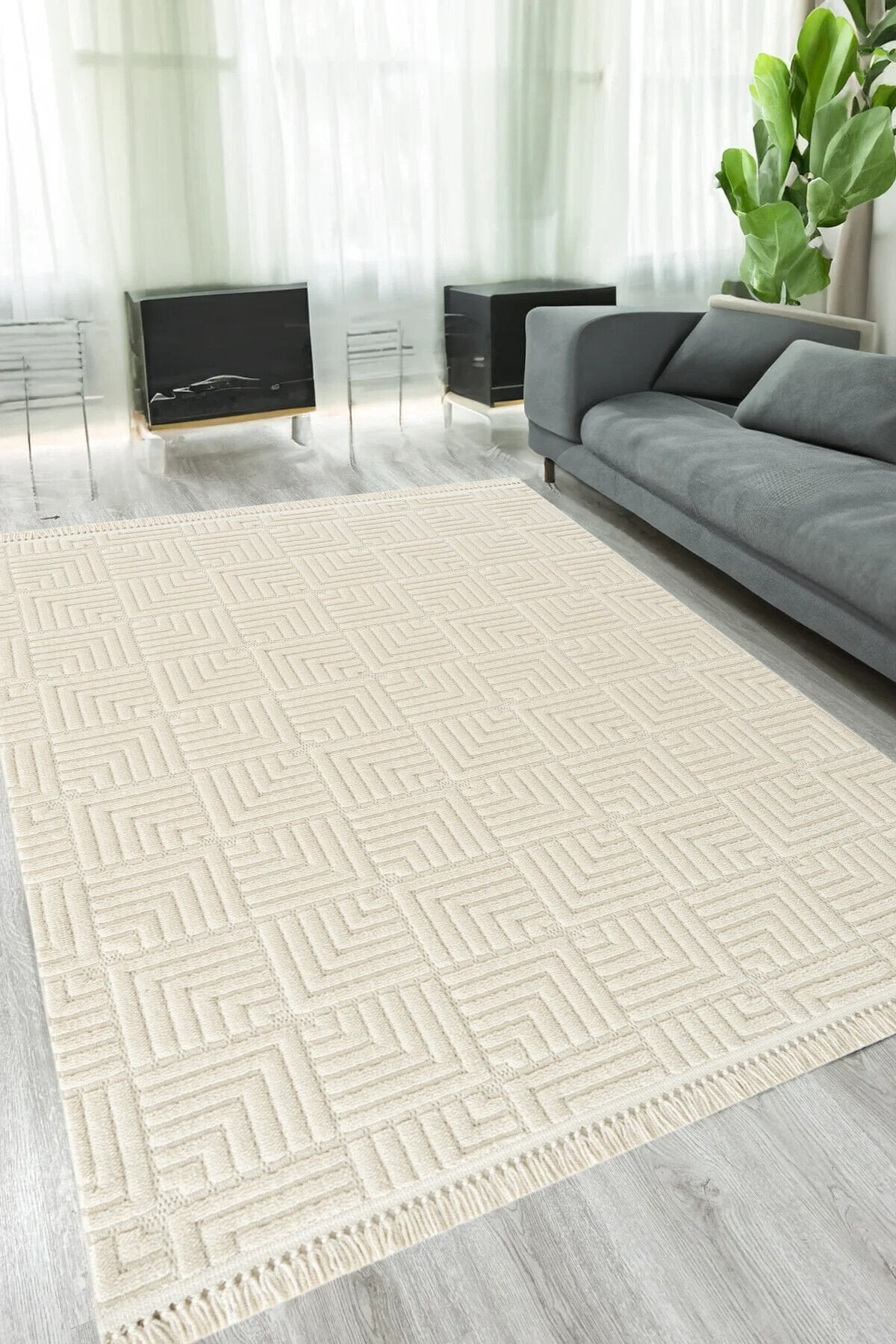 - Orta hav yüksekliği (6 - 12 mm) ile konforlu bir dokunuş sunar ve ayaklarınızın altında yumuşak bir his bırakır; - Salon ve oturma odası gibi geniş kullanım alanları için idealdir, mekanınıza modern bir dokunuş katar; - Kaymaz taban özelliği sayesinde güvenli bir kullanım sağlar, kayma riskini azaltır ve ekstra güvenlik sunar; - Dikdörtgen şekliyle çeşitli oda düzenlerine kolayca uyum sağlar ve mekânın estetiğini tamamlar; - Geometrik tema ve stil ile modern dekorasyon anlayışınıza uygun, şık bir görünüm kazandırır; - Dokuma taban yapısı sayesinde dayanıklılık ve uzun ömürlü kullanım vaat eder; - Makine halısı üretim tekniği ile yüksek kalite standartlarında üretilmiştir; detaylara verilen önemle her bir halının mükemmel olması sağlanır; - Polyester materyal kullanımı kolay temizlenebilirlik ve uzun süreli dayanıklılık sunarken, aynı zamanda kolay bakım imkanı sağlar.; - Düz saçak tipi ile sade ve şık bir bitiş sunarak halının genel görünümünü tamamlar;