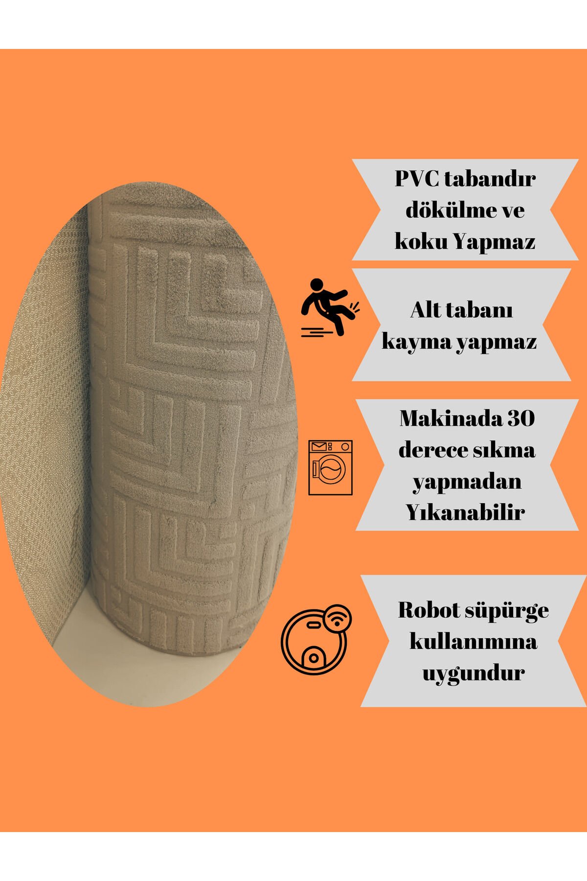 ÜRÜN ÖZELLİKLERİ Çamaşır Makinasında 30 derecede yumuşatıcı koymadan ve sıkma yapmadan yıkayabilirsiniz.; Ürün Kabartmalıdır kaymaz halı ve yolluk grubunun en üst kalitesidir.; Halı ve yolluklar rulodan kesildikten sonra halıya en uygun renkte ovarlok yapılıp gönderilmektedir.; Ürünlerimiz kargoda zarar görmemesi açısından kalın şeffaf poşet içerinde gönderilmektedir.; Bu koleksiyonun ağırlığı 2000-2300 gr / m2'dir.; Ürünler Siparişlere Göre Özel olarak kesilip Overlok yapılarak gönderilmektedir.; Dikiş Yapılırken Yolluğun En ve Boyunda 1 ile 2 cm overloktan dolayı kısalmaktadır.; Toplam yükseklik 15 mm'dir.; Ürün% 100 Polyesterden yapılmıştır ve leke bırakmaz ve temizlenmesi kolaydır.; Ürün arka tabanı ise Alman kalitesinde PVC ile kaplamadır.; Dökülme ve kayma yapmaz.; "