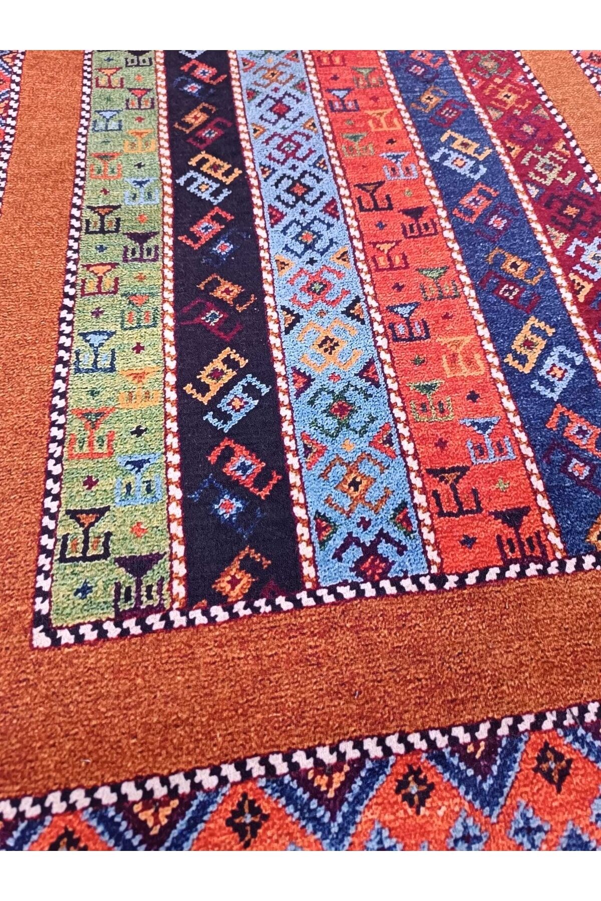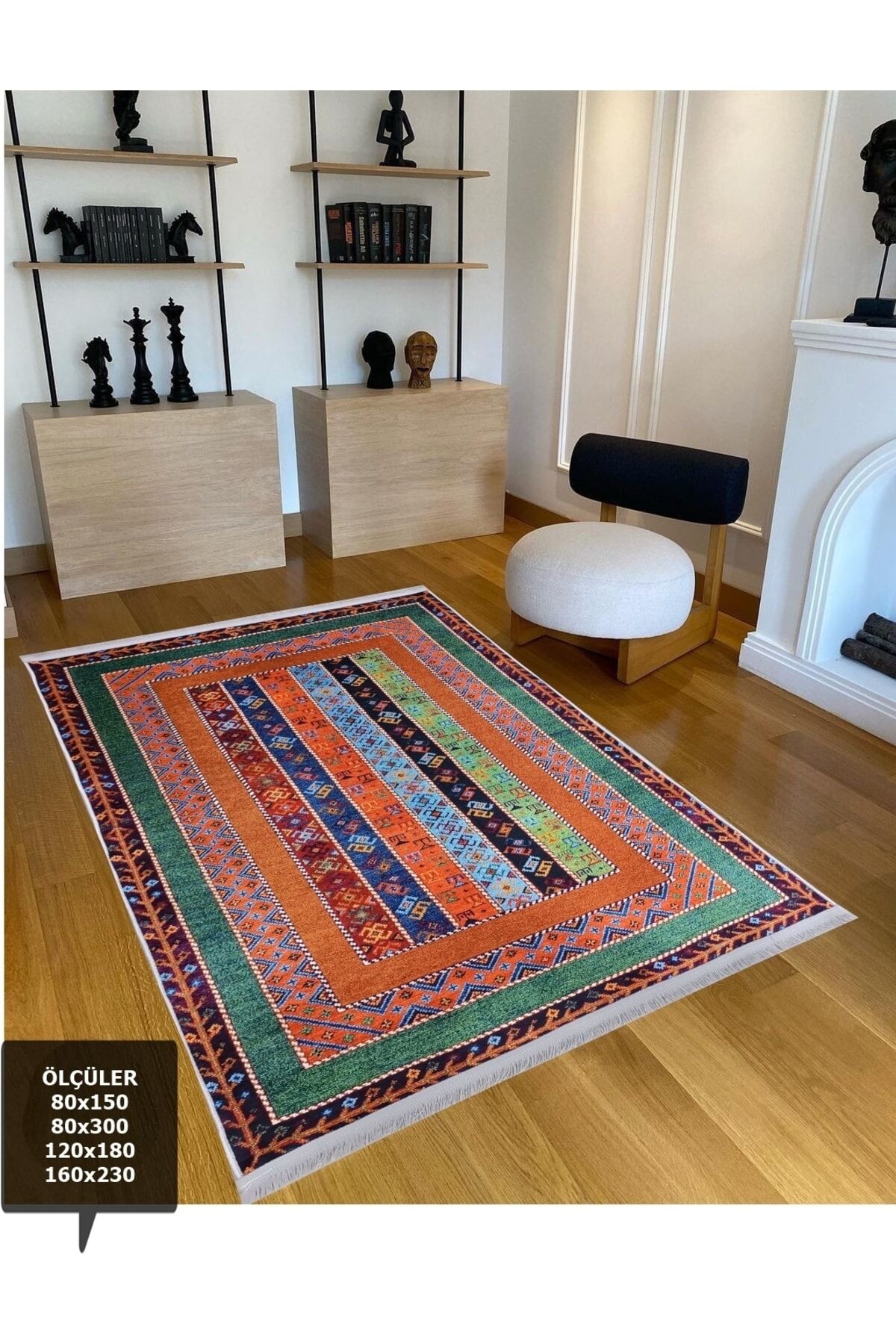- Yıkanabilir özelliği sayesinde, kolayca temizlenebilir ve hijyenik bir kullanım sunar; - %70 pamuk ve %30 polyester karışımı materyal bileşeni ile dayanıklılığı artırırken, yumuşak bir dokunuş hissi verir; - Dijital baskı teknolojisi kullanılarak üretilmiş olup, canlı ve net desenler ile göz alıcı bir görünüm sağlar; - Polyester materyal kullanımı, uzun ömürlü ve kolay bakım avantajları sunar; - Type 1 yıkama talimatına uygun şekilde temizlenmesi, kilimin formunu ve renklerini korur; - Dikdörtgen şekliyle çeşitli mekanlarda rahatlıkla uyum sağlayarak dekoratif bir atmosfer yaratır; - Pamuk taban yapısı sayesinde zeminde kayma yapmaz ve güvenli bir kullanım sunar; - Klasik tema ve stil anlayışına sahip olan bu kilim, otantik desenleriyle mekanınıza kültürel bir dokunuş katar;